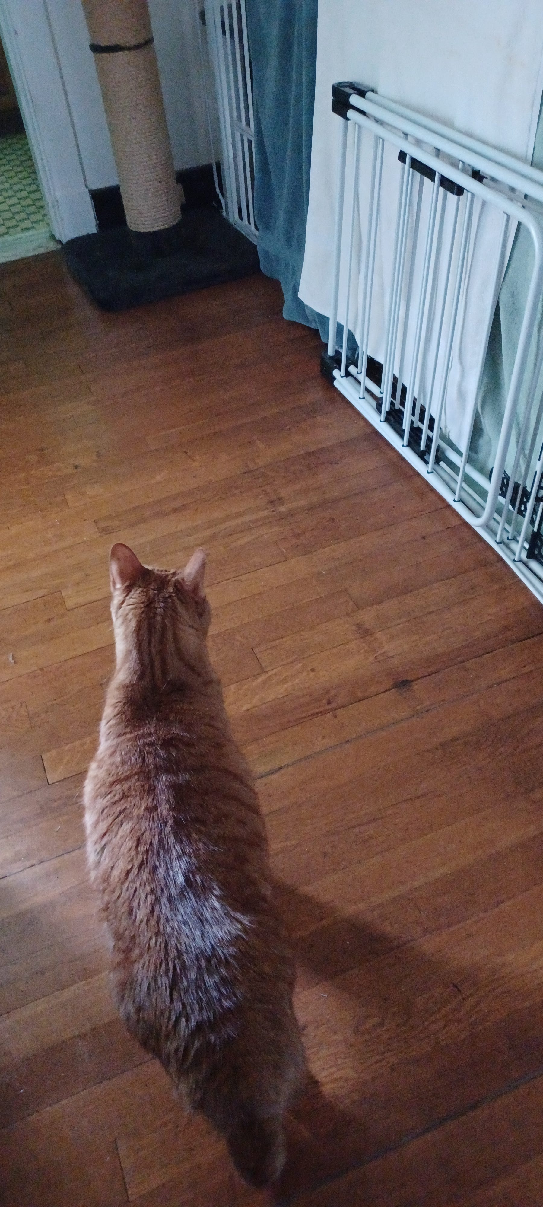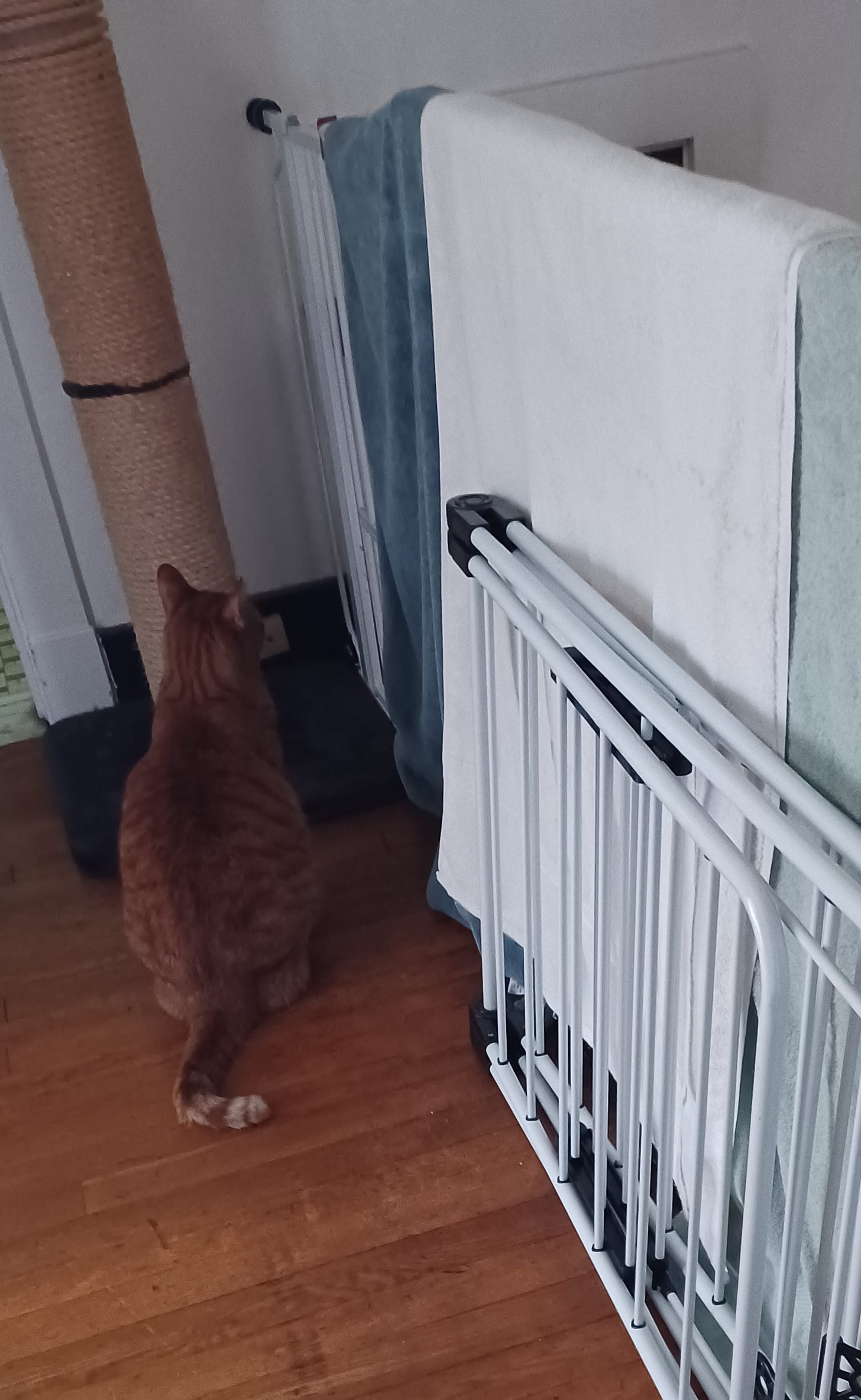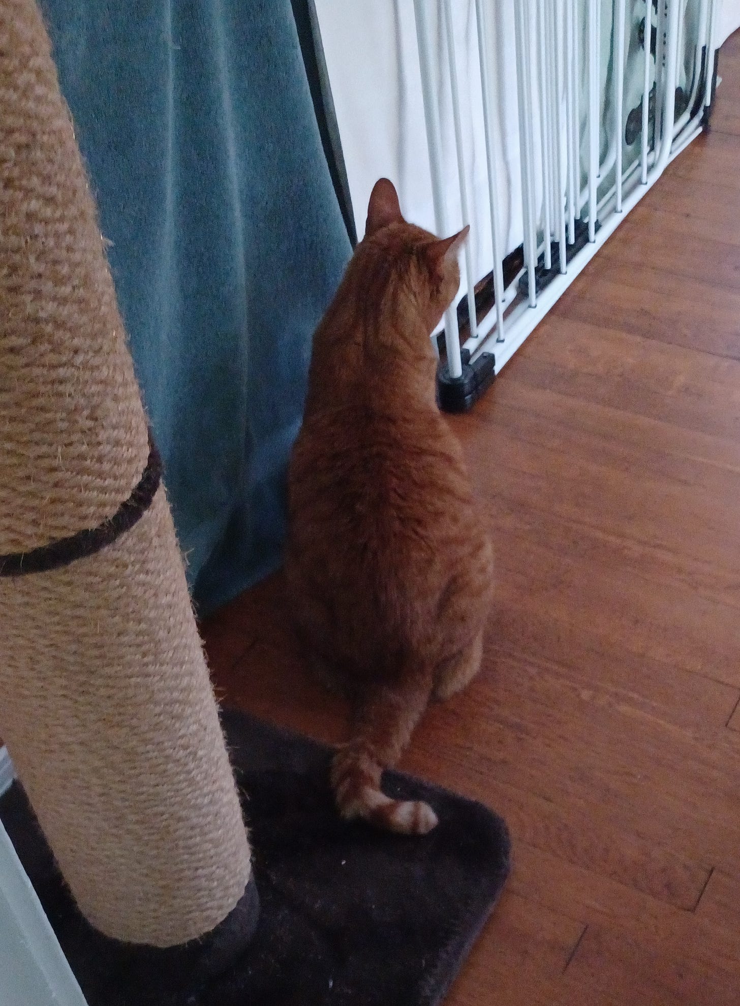 Theo is okay but needs to be confined to the inside and kept from going up and down stairs—a challenge as all who know him will recognize. More photos of his disapproval below.