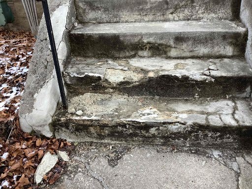 I’ve scheduled replacement of the crumbled front steps, provisionally the last week of May. If you’re scheduled to sit on a day when the front entrance is obstructed I’ll let you know about coming around to the back. In the meantime, watch your step—and be sure to use the sign-up sheets.